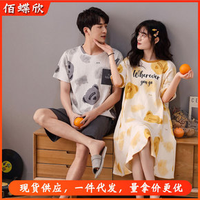 情侣睡衣春夏纯棉韩版短袖睡裙女短袖短裤男卡通可外穿...