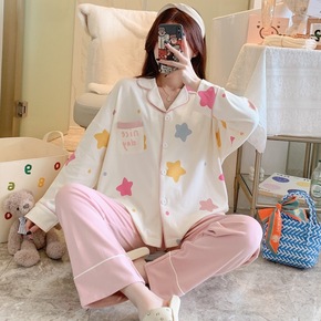 睡衣女春秋针织棉长袖开衫韩版简约卡通休闲宽松可出门...