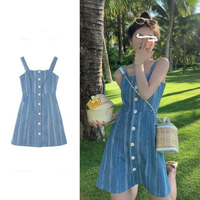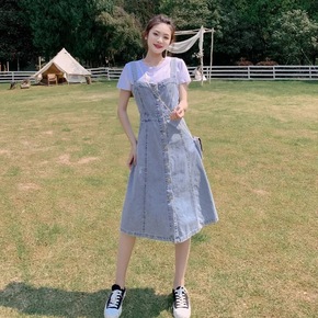 外贸爆款可甜牛仔背带连衣裙女2021新款夏天法式气...