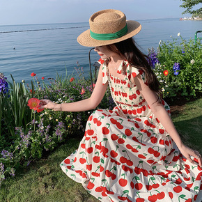 2022夏季新款法式樱桃甜美吊带连衣裙女收腰设计感...