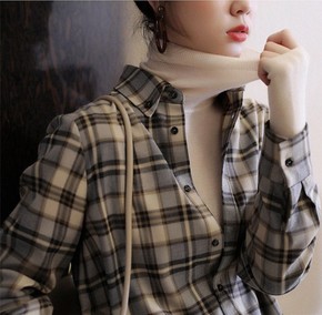 韩国 基础款文艺复古小清新衬衫长袖格子中长款学院风...