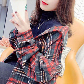 2021春秋新款拼色毛绒衬衫女中长款格子加厚长袖百...