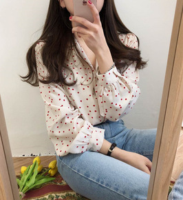 复古红色波点设计感小众长袖雪纺衬衫女2022韩版宽...