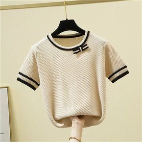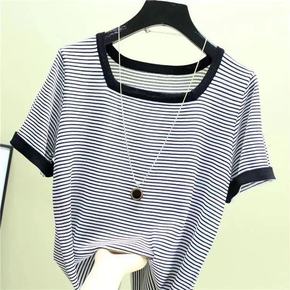 胖mm新款宽松条纹短袖冰丝针织衫女套头薄款韩版短袖...