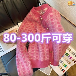 春秋新款大码200斤胖妹妹小香风粉格子软糯毛衣针织...