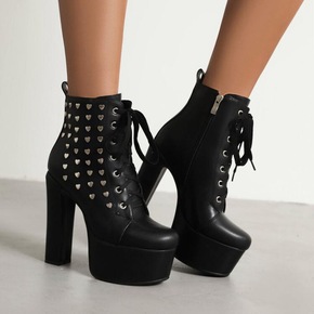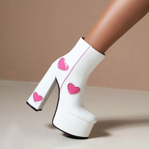 秋冬新款短靴女性感厚底粗高跟桃心拼色外贸大码拼色时...
