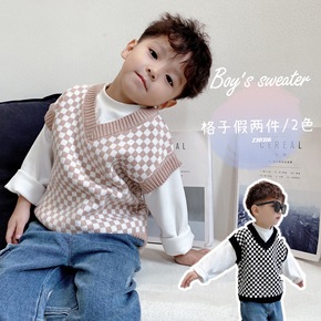 秋冬男童毛衣 爆款格子儿童毛衣假两件 棋盘背心童装...