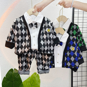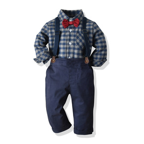2021新儿童春季衬衫套装男童英伦风领结礼服格子套...