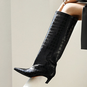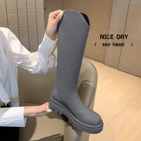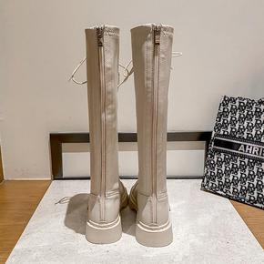 2022秋冬季新款粗跟低跟5cm侧拉链米白色过膝长...
