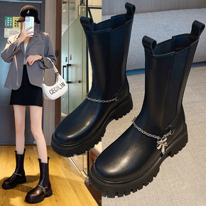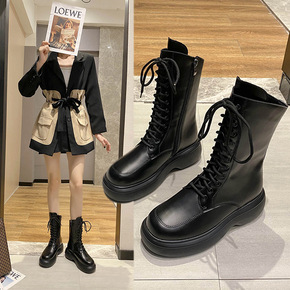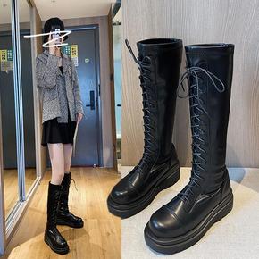 2022秋冬新款厚底松糕跟皮带扣骑士靴大筒围长筒靴...