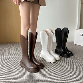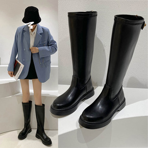 骑士靴长筒靴女粗跟2022秋季新款拼色圆头平底靴大...