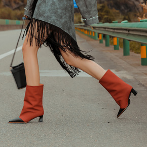 真皮裤管靴女粗跟2022秋季新款大筒围方头高筒靴两...