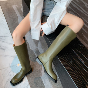 2022春秋季新款低跟长筒靴大筒围军绿色骑士靴方头...