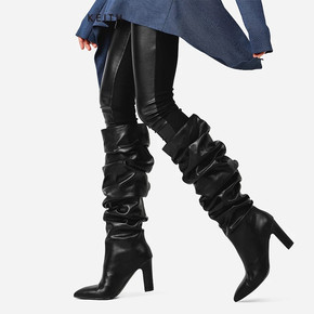 大筒围靴子新款显瘦堆堆靴粗跟高筒靴高跟骑士靴方头小...
