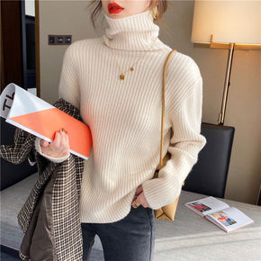 包芯纱高领坑条打底针织衫女2021秋冬新款宽松显瘦...
