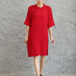 2022春夏新品棉麻女装国风复古盘扣宽松纯色立领连...