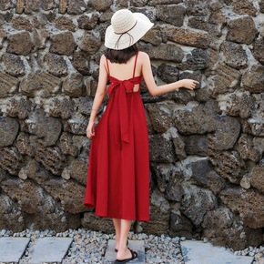 跨境女装亚马逊新款优雅收腰性感吊带连衣裙蝴蝶结锦丝...