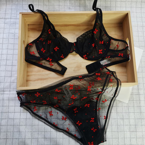 2022新款植绒绣花超薄网纱文胸套装钢托性感小胸聚...