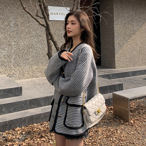 羊绒大衣毛呢外套女2022早春千鸟格羊毛韩版宽松中...