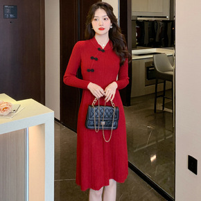 实拍旗袍针织羊毛连衣裙女秋冬季新款配大衣毛衣修身羊...