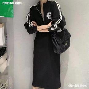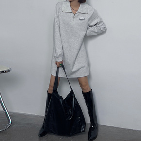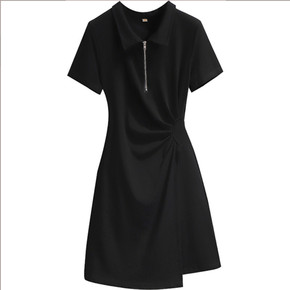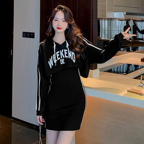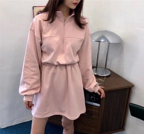 大码半拉链黑色卫衣连衣裙女中长收腰休闲裙子秋季新款...