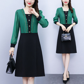 秋冬连衣裙女士宽松显瘦中长裙斜条纹上衣假两件拼接荷...
