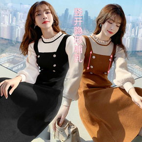 哺乳连衣裙春秋季外出辣妈款假两件针织显瘦喂奶衣服毛...