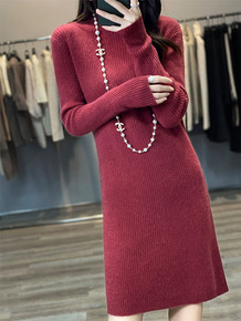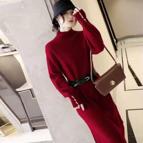 半高领羊毛针织连衣裙女秋冬新款修身中长款毛衣配大衣...