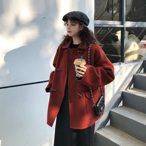 2021春秋日系牛角扣大衣红色双面羊绒羊毛呢子外套...