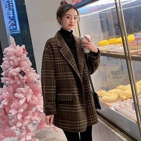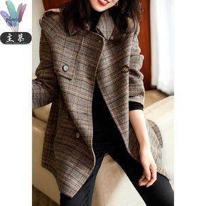 主慕2021春季新款格纹呢料外套时尚显瘦中长款双排...