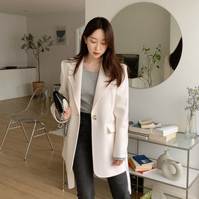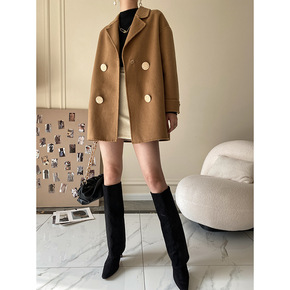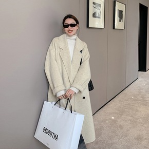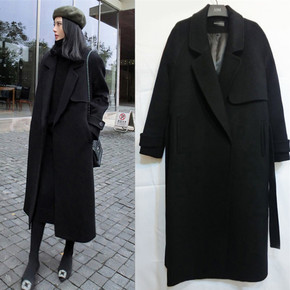 冬季女式毛呢外套东大门中长款宽松系带西服领双面手缝...
