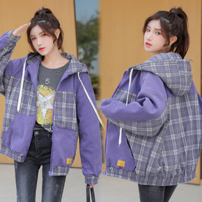 格子外套少女春秋装2021初中高中学生韩版宽松拼色...