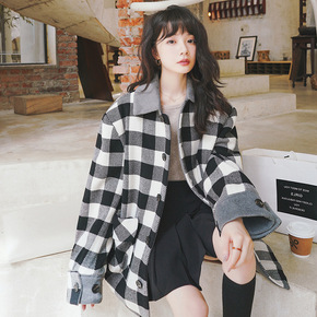 新款秋冬季毛呢衬衫外套女学生中长款韩版宽松小个子百...