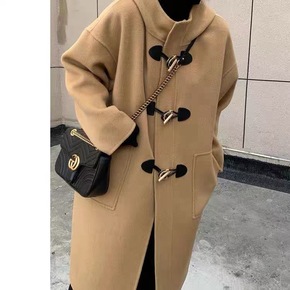 纯羊毛牛角扣大衣女2021冬新款中长款双面羊绒连帽...