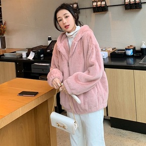 加厚毛绒外套小个子短款仿貂绒2021年刺绣连帽粉色...
