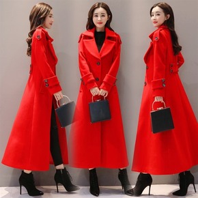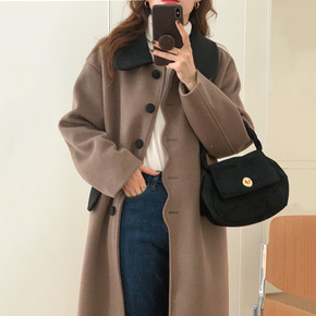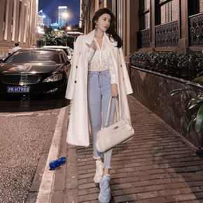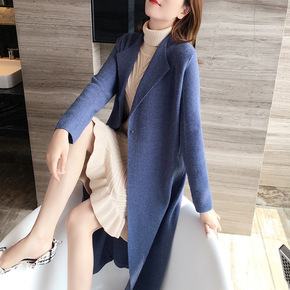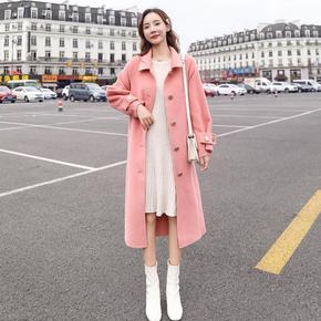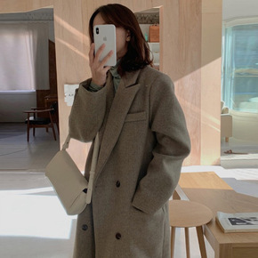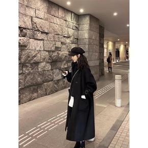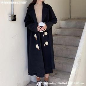 韩国chic冬季复古气质西装领两粒扣休闲长款过膝毛...