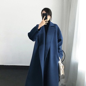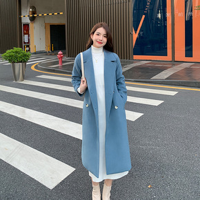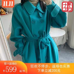 孔雀蓝双面大衣女2020秋冬新款长款宽松过膝毛呢外...