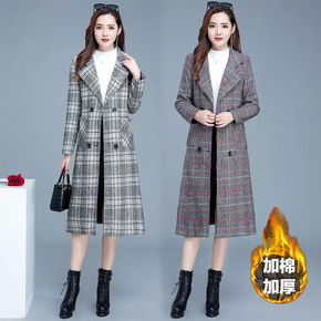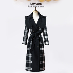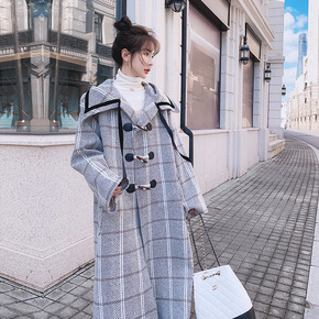 实拍新款韩版时尚chic过膝千鸟格毛呢外套秋冬拼色...