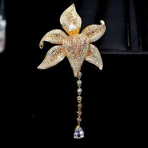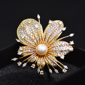 重工款铜微镶锆石兰花胸针女淡水珍珠胸花韩版时尚礼服...