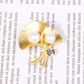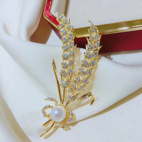 DIY配件 厚镀金微镶锆石双麦穗珍珠胸针气质别针韩...