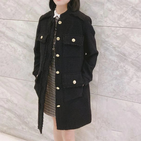 法单毛呢大衣21秋冬新款纯色小*香风腰带粗花呢中长...