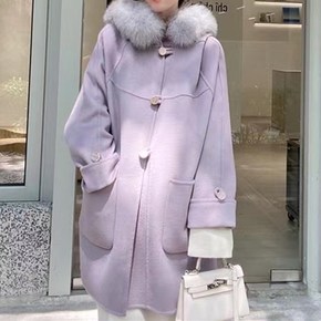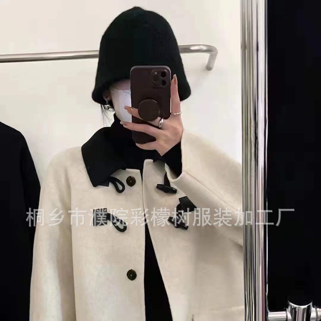 高端拼色领牛角扣大衣 双面羊绒韩版加长款廓形手工双...