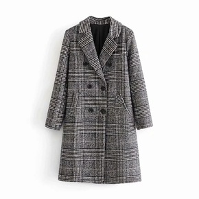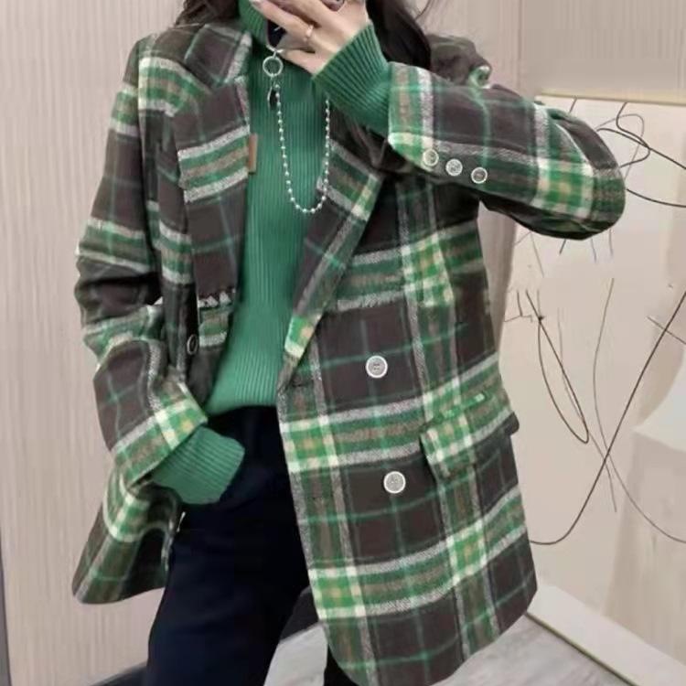 2022新款双面羊毛大衣春装小西装绿色格子毛呢外套...
