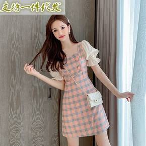 格子连衣裙女法式露背甜美裙子夏季清纯新款温柔风泡泡...