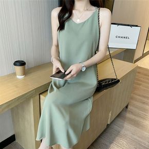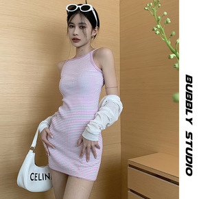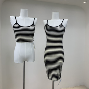 条纹撞色吊带连衣裙大露背针织包臀裙女2022夏季防...