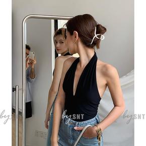 酒自制港风复古女夏新款大露背性感挂脖包臀显瘦针织连...