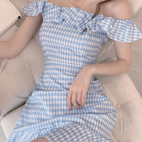 小清新格子连衣裙女装春季甜美荷叶边一字肩裙子设计感...