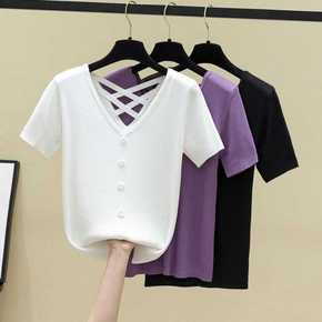 V领绑带露背冰丝短袖T恤新款百搭时尚修身设计感小众...