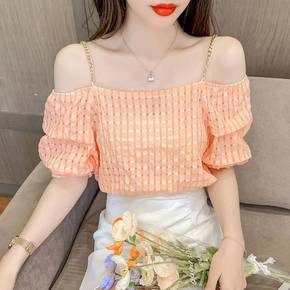 露肩衬衫一字肩上衣夏季2022年新款法式短款格子吊...