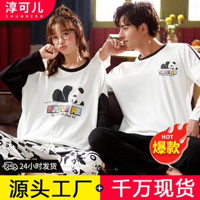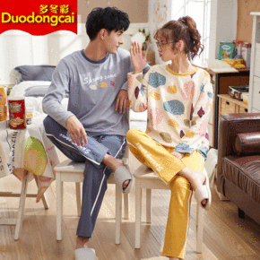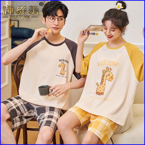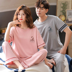 夏季潮流纯棉情侣睡衣圆领短袖长裤家居服休闲针织可外...